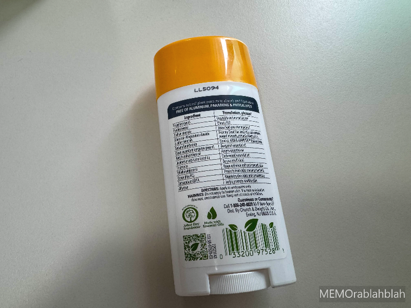 약간 달달한 우드향?입니다. 암앤헤머 데오도란트 향은 총 세가지 있어요. 로즈메리 라벤더와 무향이 추가로 있습니다. 향료 성분이 좋진 않지만 무향제품은 품절이었던 관계로 그냥 구입. 향 나쁘지 않고 바를때 산뜻한 기분이 추가되는 느낌입니다. 바르고 나면 향은 거의 나지 않아요.